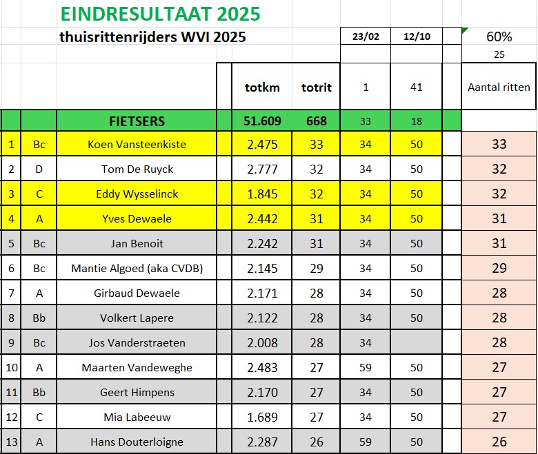 (Bij Ex-aequo gelden de meest gereden KM-ers)